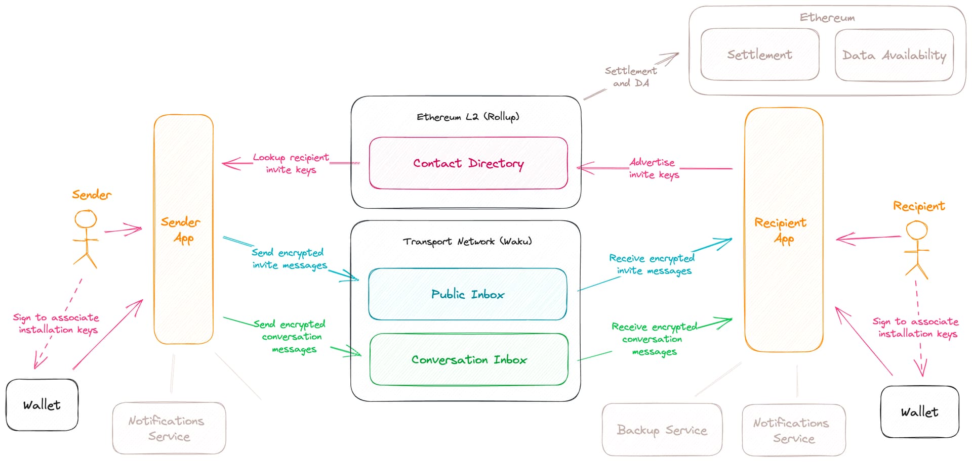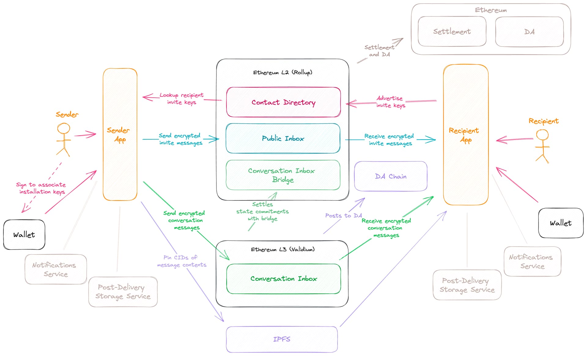 - Move conversation transport network to an L3 validium that plugs in a more scalable DA, and settles to the L2