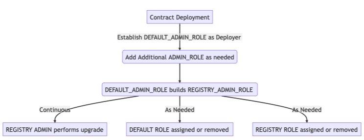REGISTRY_ADMIN_ROLE, effectively acting as contract admins with the authority to upgrade contracts. - Removing Access: At a future date, it is possible through AccessControl to remove access to all parties. For a stable contract this may be the most desirable path as there would be no need for governance at that time.
