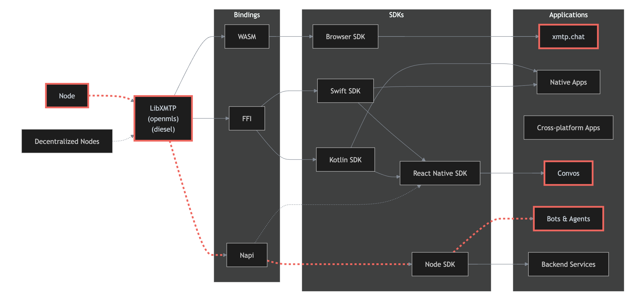 We can test all XMTP bindings using three main applications. We use xmtp.chat to test the Browser SDK’s Wasm binding in actual web environments. We use Convos to test the React Native SDK, which uses both Swift and Kotlin FFI bindings for mobile devices. We use agents to test the Node SDK’s Napi binding for server functions. This testing method checks the entire protocol across all binding types, making sure different clients work together, messages are saved, and users have the same experience across the XMTP system.