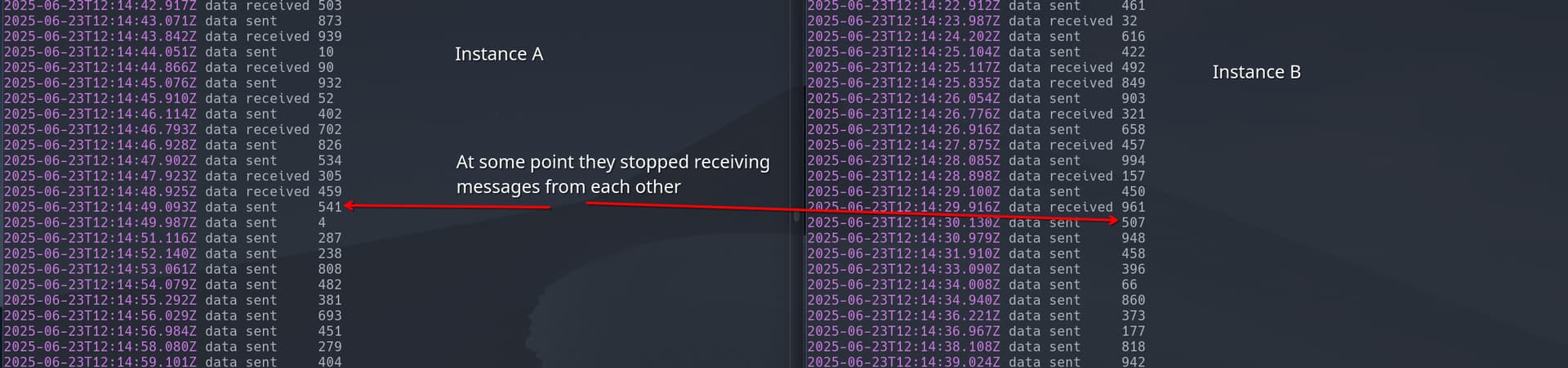 Still cannot figure it out the source of the issue, but sometimes one service doesn’t receive the message sent by the other one. I can confirm that the message is sent from one service but on the other side, the handler/callback function of .streamAllMessages() is not triggered. Since the code is built on top of my abstraction layer it would be hard to copy and paste it as a whole. That’s why I’ll give some portions of it to provide context: