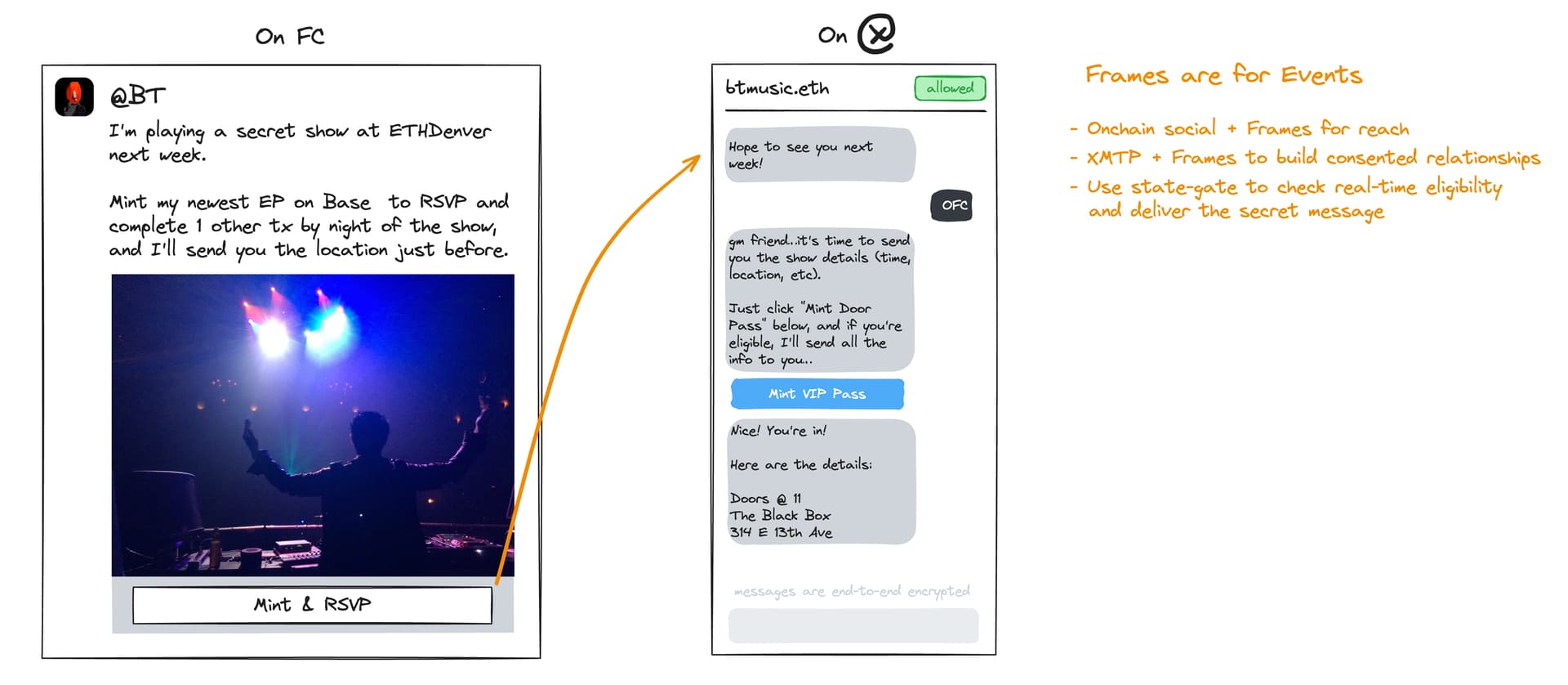 It feels like use cases where you might want to go from a public forum, such as Farcaster, to a private one, such as within XMTP messages, is a logical place to explore. These would follow a pretty typical formula of a user sharing something from their public profile, with an invitation to connect more intimately. Examples might be a creator looking to connect to fans, a brand looking to build a direct-to-subscriber base, an app exploring re-engagement tactics, etc.