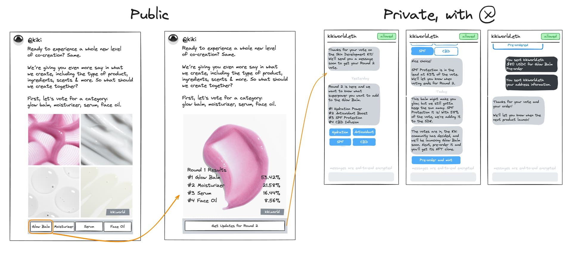 Making it possible to start from a public interaction, and take it private, opens up a ton of possibility around commercial interactions. Recently I met someone from Kiki.global who is re-thinking what a beauty brand can be through more intimate interactions with its customer base. They also add some extra web3 flare in there with NFT collectibles of the products that you get.