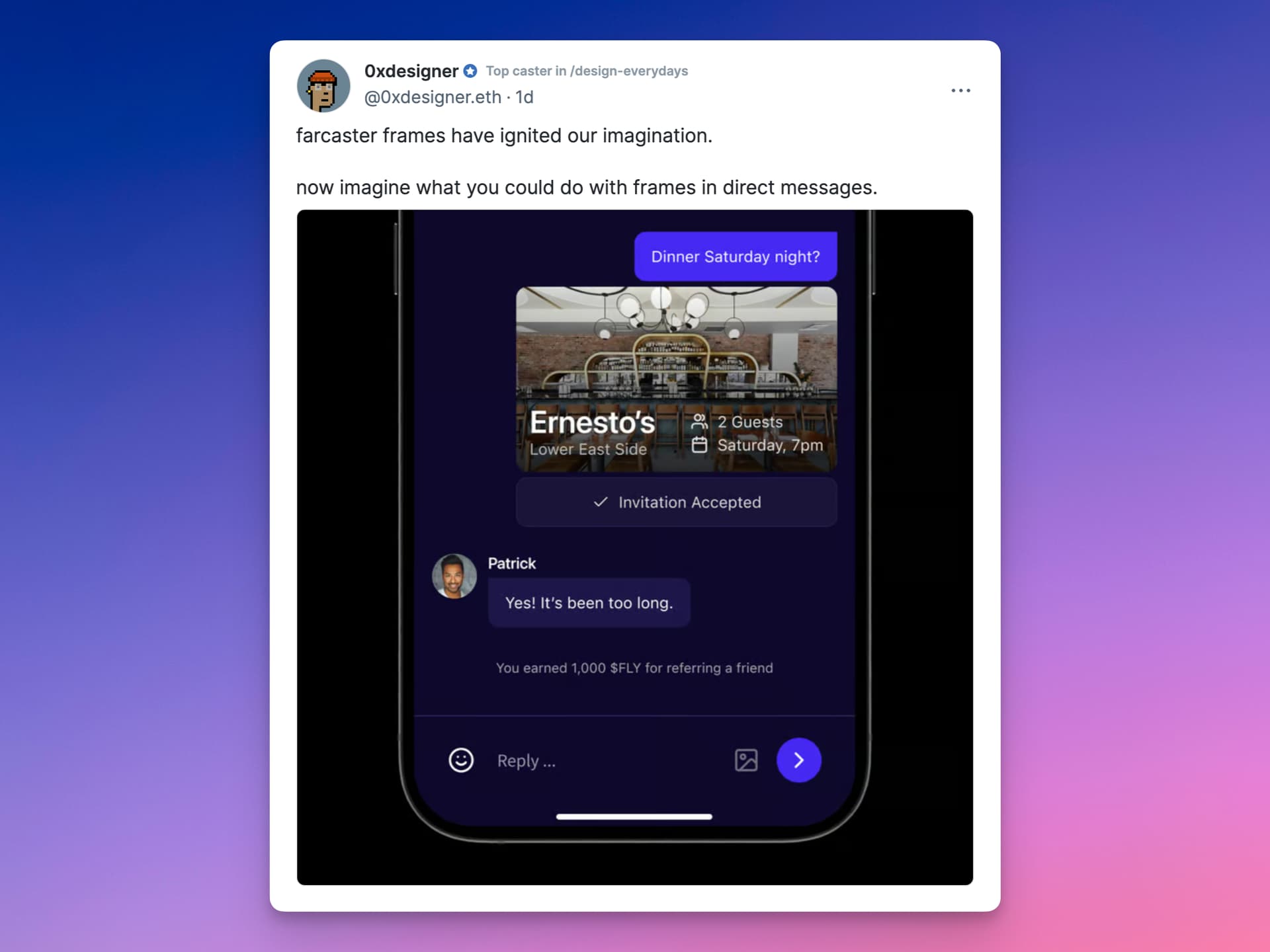 Using Frames, it would be possible to send a message with content, or an action, that unlocks based on certain criteria being met. Let’s take an example of an artist holding a secret show, which someone could RSVP for and get the address at the time of the event, all within a messaging context.