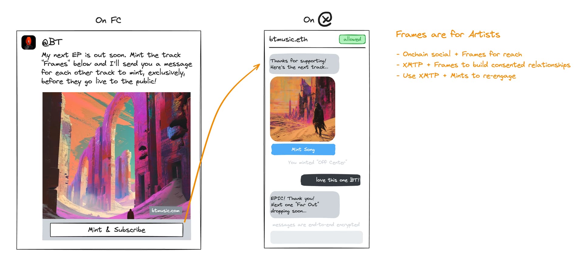 A songwriter could put up a Frame with their impending album, and send follow-up messages about its release to anyone who mints its commemorative NFT. I’d do this a ton.