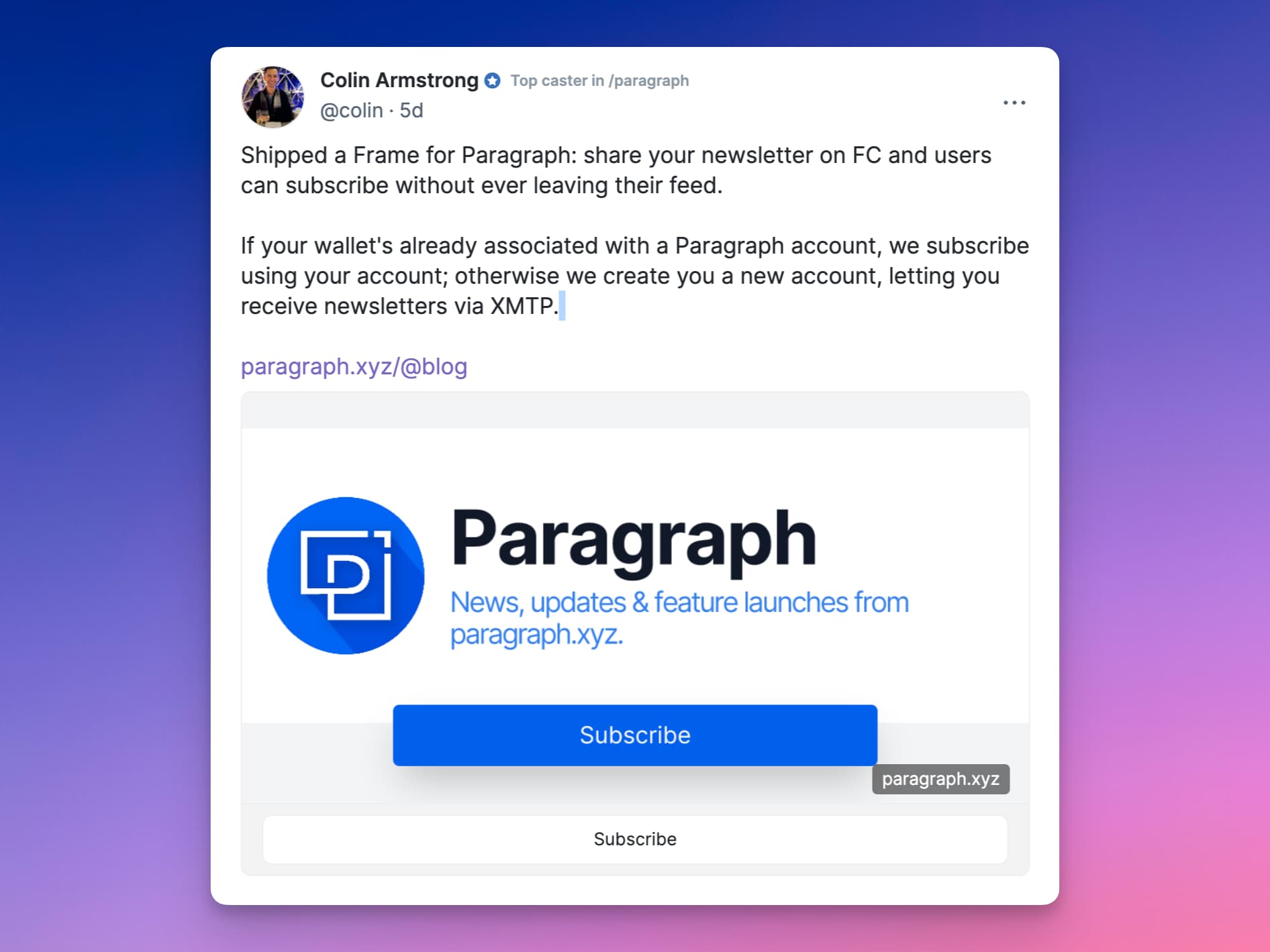 Shortly after Frames launched on Farcaster, Colin Armstrong published a frame of his own, promoting his publishing platform, Paragraph, with a “Subscribe” button right there. This meant that creators who use Paragraph to publish their content, could get new subscribers from right within Warpcast, and get notifications for new posts right to their XMTP inbox of choice (like Coinbase Wallet or Converse).