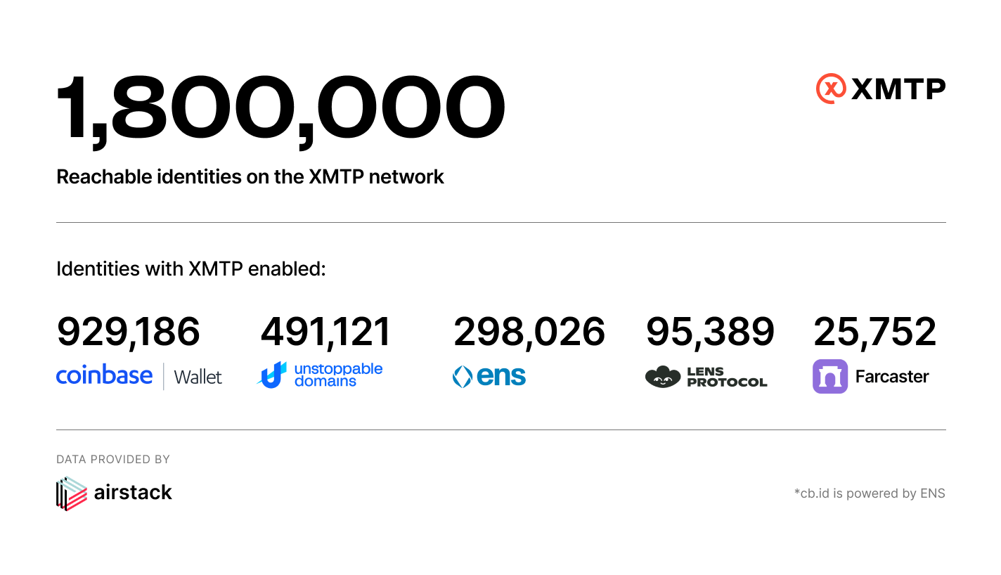 As of this week there are 1.8 million reachable identities on XMTP — reachable using Coinbase Wallet, Converse, Family, Phaver, Unstoppable Domains, and more. Full list here.